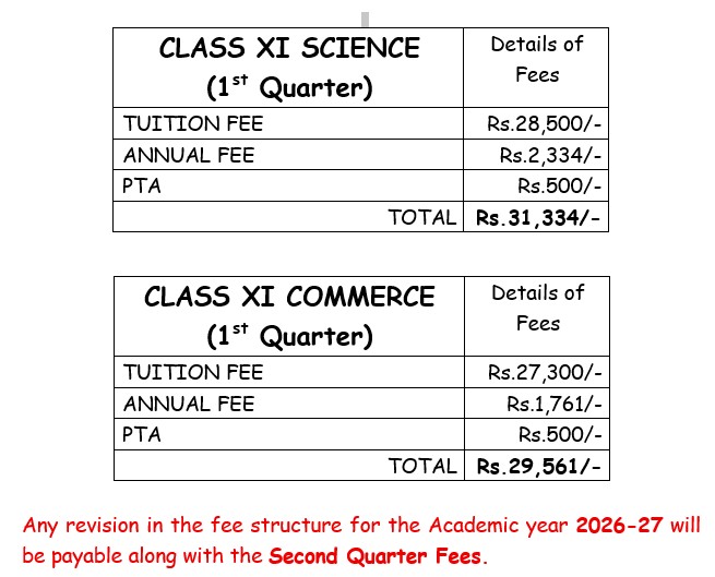 - Kindly clear your dues for the (first quarter) academic year 2026-27. Fee can be paid either online or by cheque (School Account’s office) by 04th April 2026. There will be No Concessions / Freeship / E.W.S. in Classes XI & XII.